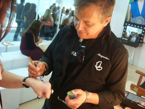 No estande da Vult, tive o prazer de conhecer o Angelo Roncalli, maquiador e consultor de desenvolvimento dos produtos da marca (é ele e o Duda Molinos, minha gente!). Ele foi um amor e mostrou pra gente as sombras flúor que a empresa está lançando.