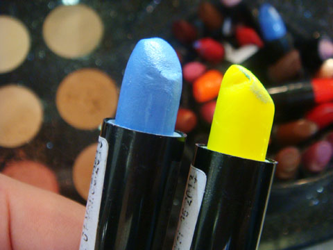 hahahahah esses batons azul e amarelos me lembram quando eu era pequena e passava confeti na boca pra ficar colorido HAHAHAHAHA (mentira, faço isso até hj)