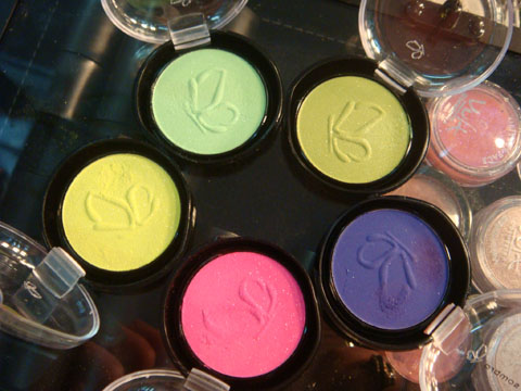 As sombras, lançamento para a feira, são em pó solto e têm micro brilhos. Achei a pigmentação de algumas melhor que a de outras, mas é preciso testar na pálpebra mesmo… Com pincel úmido, tudo pode mudar! Destaque para a laranja, a amarela e a roxa.