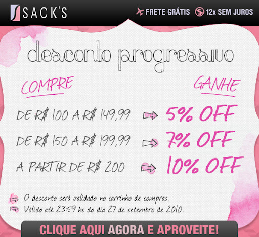 Compras Desconto progressivo Sacks 25/09/2010 Até as 23h59 de segunda-feira a Sacks estará com descontos progressivos. É uma boa oportunidade de comprar aquele batom MAC com desconto (e frete grátis). E bom sábado! Comente! Compartilhe Sabrina Olivetti você pode gostar também destes posts Presentes de Natal para homens 19/12/2011 Compras legais que fiz recentemente! 07/12/2021 Shampoo seco 24/07/2009 Comente! deixe um comentário cancelar respostaNome * E-mail * Site Δ
