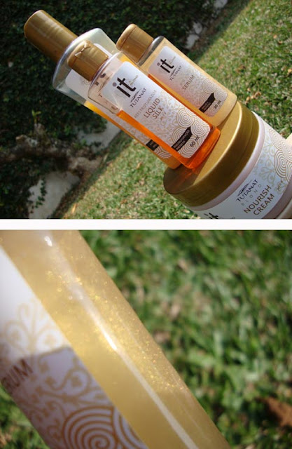 O kit It´s Blond, da Tutanat, por si próprio já é meio diferente: invés de shampoo e condicionador, a linha é composta por shampoo, líquido reestruturador (chamado Liquid Silk), creme de hidratação (Nourish Cream) e serum.