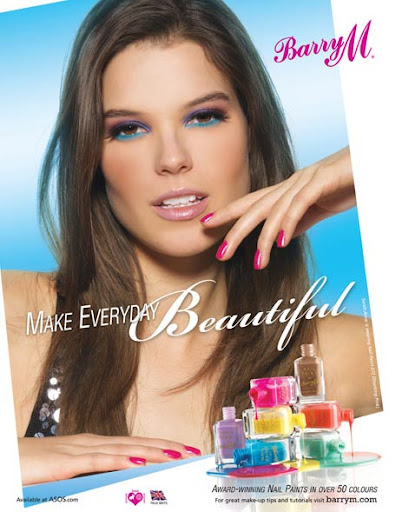 Essa aqui debaixo é uma propaganda da marca inglesa Barry M (já que o assunto é esse, apesar de nunca ter usado as maquiagens, gosto muito dos esmaltes da marca), também com turquesa e um azul mais royal.
