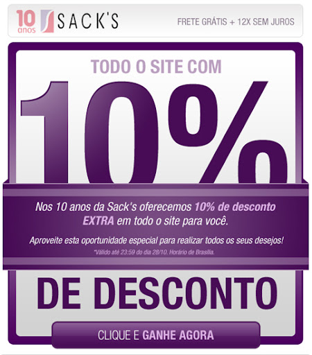Hoje a Sacks completa 10 anos de vida e para comemorar está oferecendo 10% de desconto em todas as compras.