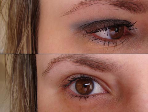 Não vou dizer que ele tira 100% da maquiagem à prova d´água, porque isso pra mim é milagre, mas chuto uns 98%, vai? E isso sem deixar os olhos vermelhos nem fazer com eu arranque cílios de tanto esfregar. Olhem a prova aqui embaixo: