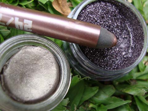 Da esquerda para a direita… Lápis UD, delineador Smashbox e sombra Pure Shine da Vult. O lápis tem uma cor que puxa mais pro castanho, mas ele tem uns brilhos meio cinzas (ou to louca? acho que a comparação com os outros 2 faz o lápis parecer mais marrom). Ele serve de base também!