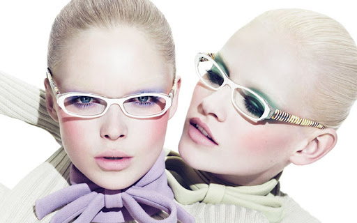 Mas nada é uma regra fixa. Basta ver a campanha da Miu Miu (foto aqui embaixo) com sombras supercoloridas e óculos com armação branca marcante. Acho que tudo depende da pessoa, do estilo, etc e tal. Mas tem que saber compor o look para não ficar carregado.”