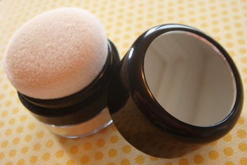 A embalagem, com espelho em cima, é pequenininha – cabe na palma da mão – e tem aquele formato que a gente já viu em outras marcas: esponja acoplada ao pote com pó solto! Particularmente, nunca tinha experimentado usar nada com essa apresentação e confesso que prefiro abrir a tampa e passar o pincel para aplicar, viu? Me dá muita agonia não saber se o produto está vindo, parece que não vou conseguir controlar direito a quantidade. Mas para retoques ao longo do dia talvez até seja uma boa opção.