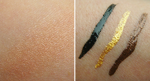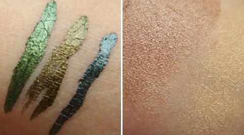 Mais delineadores coloridos e brilhantes: Treat Me Nice, Desires & Devices e Marked for Glamour (dois primeiros: Burmese Beauty; último: Leopard Luxe). Pigmentos: Gold Stroke (Burmese Beauty) e Lithe (Leopard Luxe).