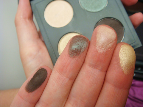 Olhem que lindas as cores desse quarteto de sombras! Em sentido horário, começando pelo círculo de cima, à esquerda, os nomes são: Courtly, Palace Pedigreed, Russian Blue e Quite Spoiled.