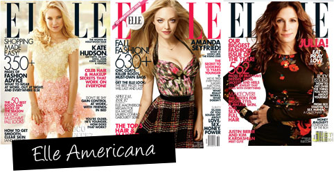 E já reparou como cada uma tem um estilo? Começando pela Elle brasileira, nela tem sempre uma modelo com metade do corpo aparecendo, fundo claro e usando alguma roupa vinda diretamente das passarelas. Já sua prima americana, mantém o fundo claro mas as escolhidas para a capa são atrizes. Na Elle do Reino Unido o padrão não fica muito visível, mas as escolhidas também são as celebridades.