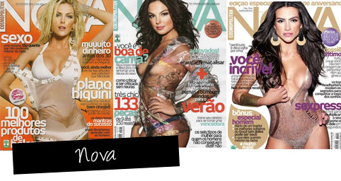 Não dá para falar de padrão de capa sem falar da Nova. Lá sempre tem alguma famosa no total estilo mulherão, cabelo volumoso, make de bonita e com roupas mínimas. As fotos quase poderiam estar numa revista masculina!
