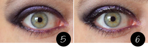 5. Coloquei sombra bege logo abaixo da sobrancelha, usei o lápis lilás bem rente aos cílios na parte de baixo dos olhos e no cantinho externo apliquei a sombra azul escura.