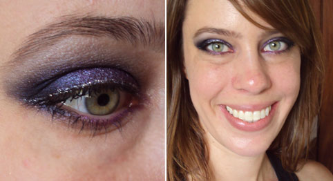 Para esse visual usei uma sombra lilás e outra azul escura. Usei também um delineador da Eyeko que é puro glitter, mas claro que esse item é opcional.