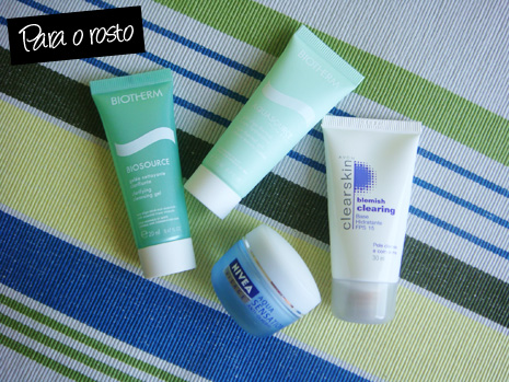 Minha ideia é tentar manter por lá os tratamentos normais que faço no rosto quando estou na cidade, mas sem precisar levar aquele monte de frasquinhos… Por isso, optei por sabonete líquido e hidratante para peles oleosas da Biotherm (em versão mini), anti-olheiras da Nivea e base hidratante da Avon (com FPS 15, mão na roda para uma pele hidratada, protegida e com imperfeições cobertas).