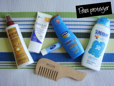 E, pra terminar, a parte mais importante para quem quer passar tranquila pela estação mais quente do ano: a proteção! Para não torrar o cabelo, estou levando leite para pentear da Elsève, que promete ser anti-sal, anti-cloro e anti-ressecamento. O rosto vai ganhar protetor Ansolar com FPS 30. Já na boca, passarei lipbalm Nivea com FPS 4. Para o corpo, protetor com FPS 15 que de quebra bronzeia, também da Nivea, e protetor Sundown FPS 30 (para os dias iniciais de praia, porque sou branquela).