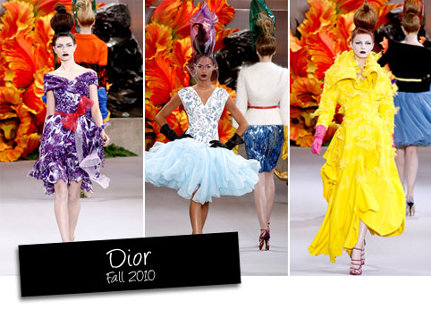 Com todas essas cores não dá para não imaginar um jardim no desfile de Galliano. Com as roupas coloridonas, os cabelos “em pé” complementavam o visual bem maluco das “flores” na passarela. Esse primeiro vestido roxo é meu sonho de consumo na vida (vai sonhando, Sabrina!)