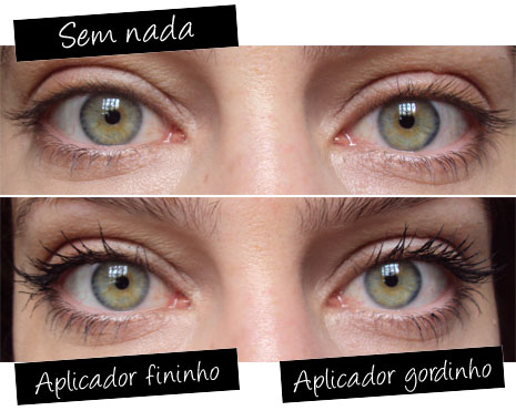 Tá, mas tirando a parte da curiosidade embalagística, achei que o rímel é bom sim. O aplicador rosinha deixa os fios mais grudadinhos, mas o aplicador com glitter deixa os fios mais volumosos, gostei mais desse lado mais drama. O valor é de aproximadamente R$83.