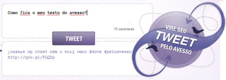 É só seguir o perfil de Dove no Twitter, o @Dove_Brasil. Daí é só ficar alerta: assim que eles avisarem por lá que a promoção está valendo, você só tem que postar uma mensagem do avesso usando a ferramenta que tem no site da marca. As 30 mais velozes do dia garantem a blusinha.