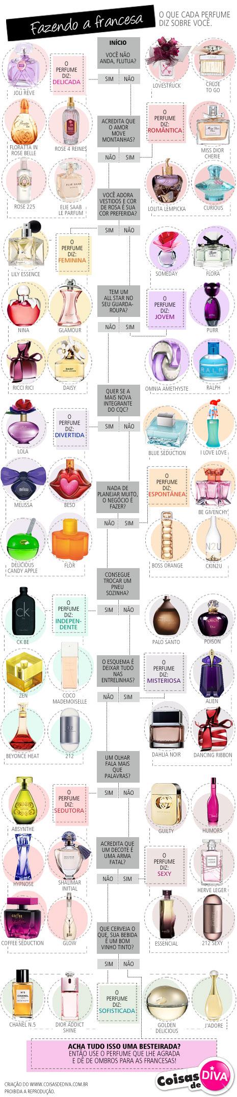 Mas que trabalho difícil esse de saber o que o perfume está “dizendo”! Que um floral é delicado e que um aroma forte é extravagante a gente sabe, mas e o resto das nuances? Por isso passei o dia lendo descrições e resenhas de perfumes. Já reparou como as empresas descrevem elas? Além das notas de saída, cabeça e fundo eles contam qual é a mulher que representa aquele aroma e foi nisso que me baseei para montar este infográfico.