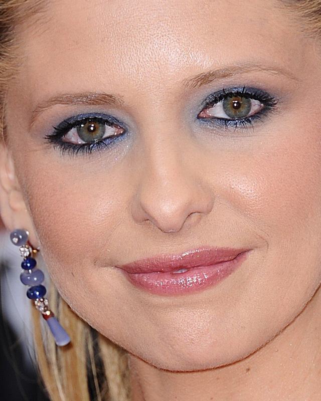 Sarah Michelle Gellar apareceu no tapete vermelho com sombra azul, ornando com o tom de seu vestido.