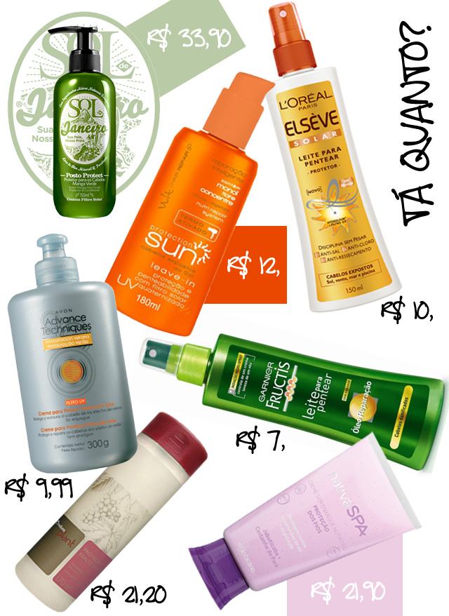 Sol de Janeiro – Posto Protect – Protetor para os Cabelos Manga Verde | L’Oréal – Elsève Solar – Leite para Pentear Protetor | Vult – Protection Sun – Leave-In | Garnier Fructis – Óleo Reparação – Leite para Pentear | Avon – Advance Techniques – Creme para Pentear Proteção Solar | Natura Plant – Proteção e Realce da Cor – Creme Protetor UV Diário | O Boticário – Nativa SPA Creme sem Enxágue Nutritivo Proteção dos Fios Jabuticaba + Castanha do Pará