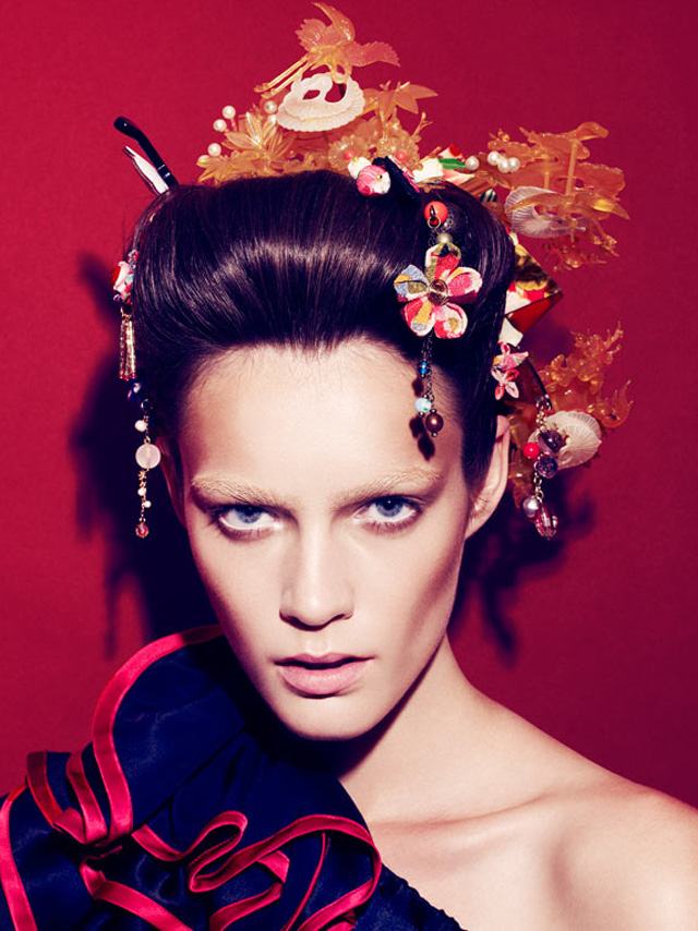Estou encantada com esse cabelo de gueixa, cheio de detalhezinhos para enfeitar! Para imitar, é preciso colocar os fios todos para cima, fazer volume desfiando e prender. É como um coque bem gordo, só que em volta da cabeça toda e bem pro alto! Os enfeites você pode comprar em casas de festas ou fazer em casa mesmo!