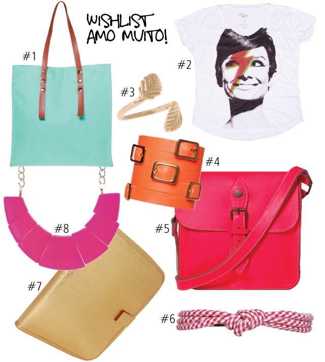 #1 Bolsa Candy Verde Água | #2 T-Shirt Audrey | #3 Anel Falange Folhagem Dourado | #4 Bracelete Girl Power Laranja | #5 Bolsa Carteiro Neon Rosa | #6 Headband Xadrez Vichy | #7 Porta Ipad Metalizado Dourado | #8 Maxi Colar Swing Pink