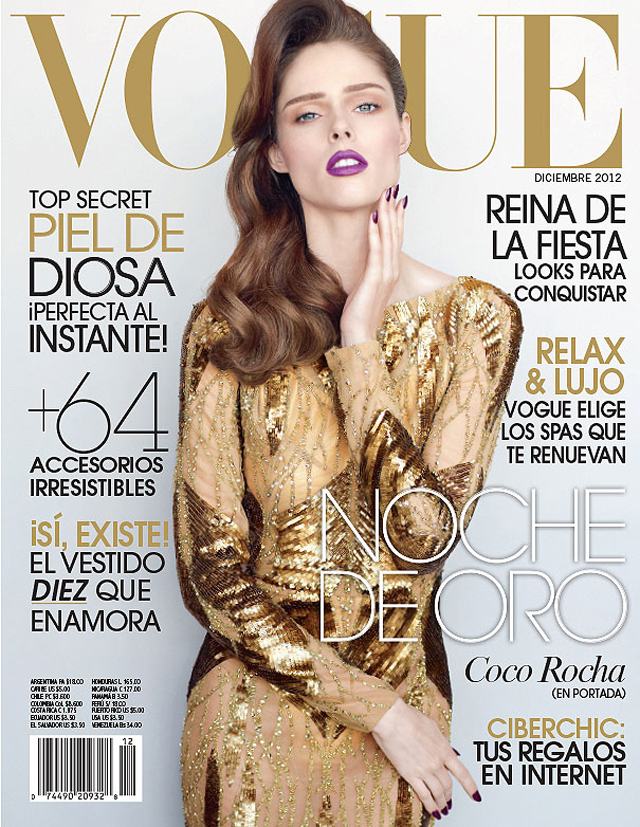 Curti muito o glamour mexicano dessa capa com a Coco Rocha na Vogue México. São 3 versões diferentes, com direito a muito dourado e batom + esmalte (roxos) combinando! Isso sem falar nesse topete gigante! É exagerado, claro, mas interessante.