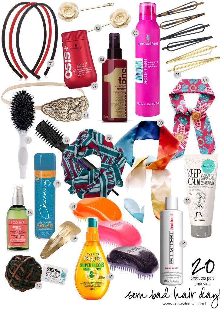 01. Kit de Tiaras Accessorize | 02. Pó para Volume Osis, na Beauty Bay | 03. Grampos Carved Rose Accessorize | 04. Leave-In 10 em 1 Uniq One, na Beleza na Web | 05. Spray Fixador Hold Tight Lee Stafford, ma Sephora | 06. Presilhas Basic Accessorize | 07. Twilly Caju Lupi Design | 08. Twilly Pôr-do-Sol Lupi Design | 09. Lenço Scarf Me, na Farfetch | 10. Faixa Charleston Accessorize | 11. Escova Boar Detangling Brush, na Sephora | 12. Escova Rotating Air Brush Light Edition Conair, na Polishop | 13. Spray Charming Argan, na Lojas Rede | 14. Tangle Teezer, na Beauty Bay | 15. Spray Reparador Leave-In L’Occitane | 16. Tic-Tac The Beauty Box | 17. Prendedores de Cabelo Super Ball The Beauty Box | 18. Super Óleo 8 Garnier, na Lojas Rede | 19. Modelador Paul Mitchell, na Beleza Na Web | 20. Silicone Anti-Frizz Keep Calm The Beauty Box