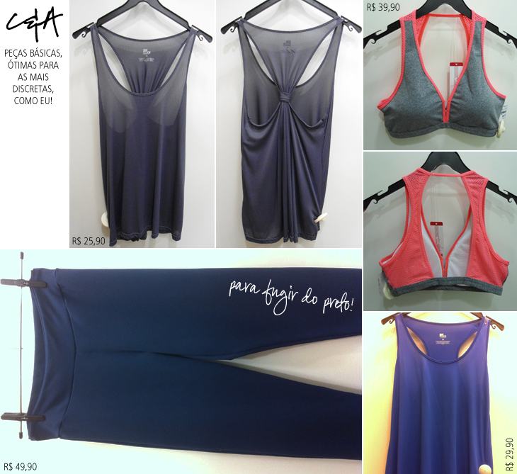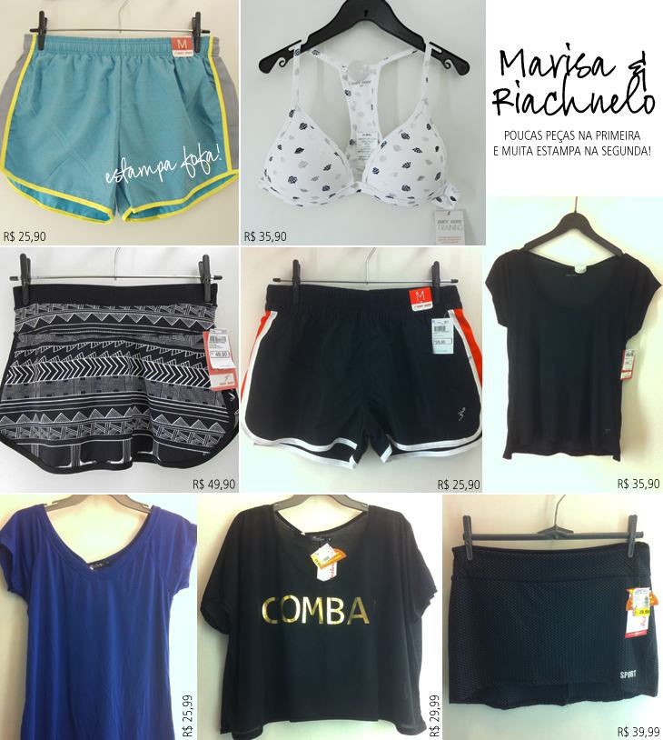 A parte fitness da Marisa do Shopping Estação, também aqui em Curitiba, é bem mirradinha. Achei tudo de gosto duvidoso, mas consegui salvar três roupas, que são essas da parte de baixo da montagem. Na camiseta do meio está escrito “Combat”, ela é em estilo cropped e pode ser usada por cima de uma regada mais justa. Na Riachuelo, que fica no mesmo shopping, tem bastante coisa, tudo colorido e estampado. Amei o shorts-saia com estampa étnica! E os shortinhos de corrida? Um amor!