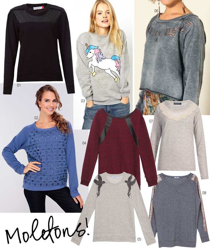 01. Moletom Nuage, por R$ 138,60, na Farfetch | 02. Moletom Renner, R$ 89,90 | 03. Moletom Asos, $ 47,04| 04. Moletom Daniele Mabe, R$ 380,00, na OQVestir | 05. Moletom Flower Power, R$ 312,00, na OQVestir | 06. Moletom Farm, R$ 269,00 | 07. Moletom Vi And Co, R$ 268,00, na Farfetch | 08. Moletom Riachuelo, R$ 79,90