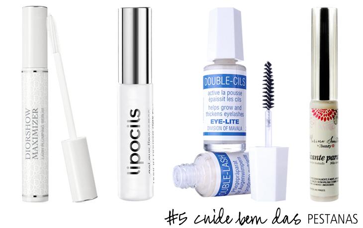 Falando em cílios fortes e saudáveis, quem está com eles fraquinhos pode experimentar os fortalecedores específicos para a área. O uso indicado é à noite, sem nenhum tipo de produto. Diz que ajudam nos crescimento – alguns prometem resultados visíveis em 28 dias! Coloquei algumas opções na montagem: Dior, Talika, Mavala e Marina Smith. Nunca experimentei nenhum, mas quem tiver experiências pode compartilhar nos comentários!