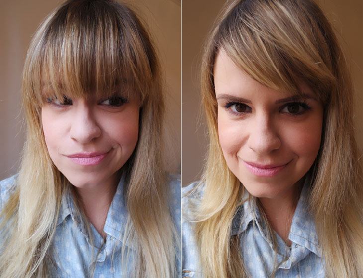 Então eu uso nesses dias – de bad hair day – ou quando minha franja está muito longa, que é o caso das fotos. Como meu cabelo é bem liso, ela não fica assim pro lado naturalmente. Simplesmente não vai. Aí eu coloco um pouquinho do pó e vou ajeitando para deixar como eu quero.