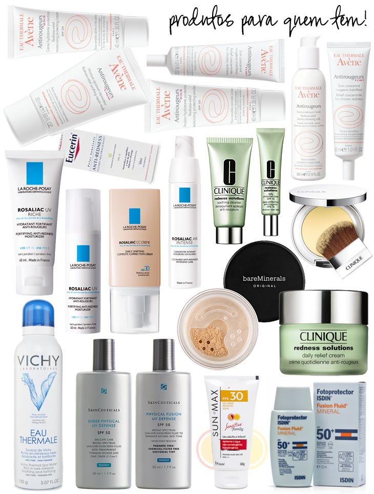 Eu tenho rosácea e já usei inúmeros produtos porque gosto de testar coisas novas ,apesar do risto para meu tipo de pele.Leio sempre meu livro preferido da Leslie Baumann dos 16 tipos de pele porque ela explica muito bem os cuidados com a pele com rosácea.No momento uso esses produtos da avene ,skinceuticals serum 10,azelan(o que realmente fez efeito evitando as pápulas),maquiagem bareminerals e seu tratamento para rosácea e o pó noturno da bareminerals mesmo que acalma muito a minha pele.Já usei clinique e gostei muito.Mas sempre vou a minha dermato e fiz laser,o que melhorou a minha pele em 80% .
