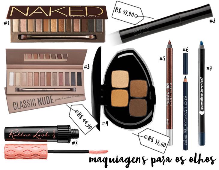 #1 Paleta de Sombras Urban Decay | #2 Máscara para Cílios Mary Kay | #3 Paleta de Sombras Panvel | #4 Quarteto de Sombras O Boticário | #5 Lápis para Olhos Urban Decay | #6 Lápis para Olhos Bourjois | #7 Lápis para Olhos Quem Disse, Berenice? | #8 Máscara para Cílios Benefit