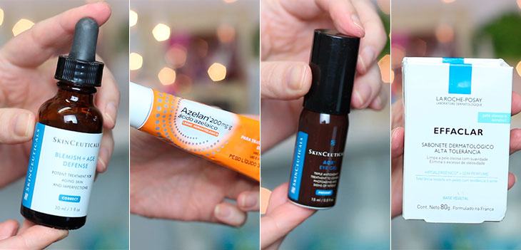 Produtos mostrados e links para as resenhas: Óleo de Limpeza Shu Uemura, Demaquilante The Body Shop, Sabonete Effaclar, Pomada Azelan (não tem resenha), Blemish + Age Defense Skinceuticals, AOX Eye Gel Skinceuticals (não tem resenha), Urepel, Hidratante Natura, Hidratante Caudalie, Balm Nivea.