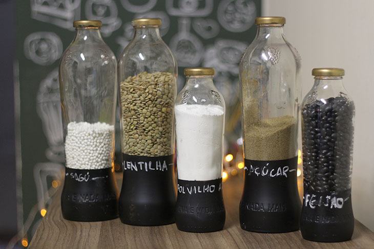 Juntei por aqui garrafas de suco, dessas de vidro e com a boca larga, assim poderia colocar grãos diversos ali dentro sem me preocupar em ficar chacoalhando muito para tirá-los ali de dentro. Limpei as garrafas, tirei o rótulo e pintei elas com tinta spray fosca, de uma forma que pudesse escrever com giz.