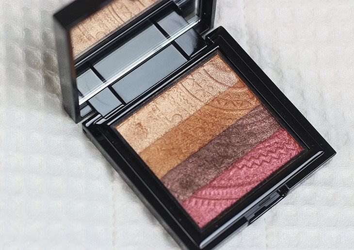 O quarteto tem um tamanho bem bom e uma decoração em relevo bonita, mas não se apegue a ele porque com o uso, o desenho vai sendo apagado. Mas tudo bem né, maquiagem foi feita para ser usada! Os tons desse quarteto são dourado, bronze, marrom e ameixa. Essa última me lembrou muto a Cranberrie, da MAC. Todas elas são cintilantes e entregam uma cor bem forte.