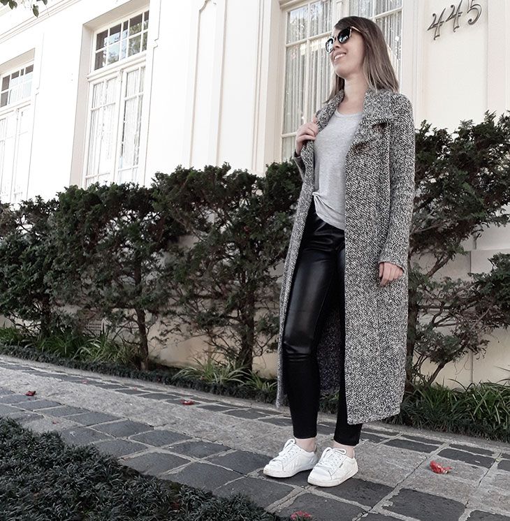 Adorei! Nunca tinha pensado em usar calça de couro com tênis, e fica bom! Adorei o macaquinho também, tem mais looks com o casaco e roupas coloridas?