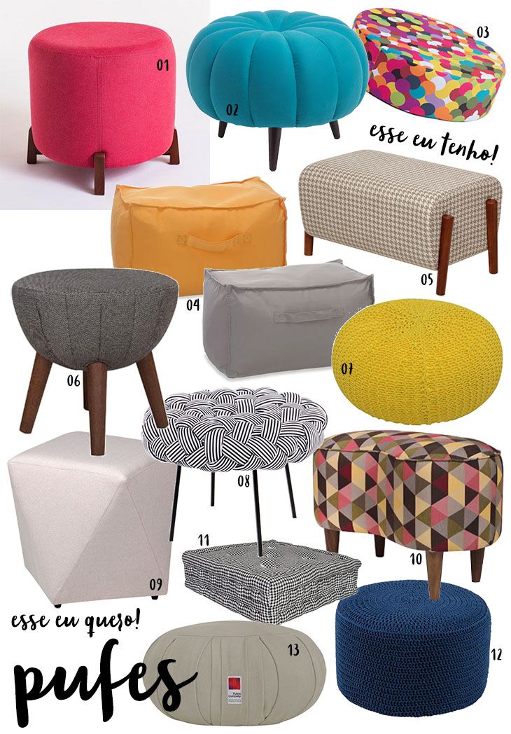 Consta aqui nos meus arquivos cerebrais que os pufes são excelentes companheiros para bancadas de maquiagem ou penteadeiras (contudo, é preciso ficar sempre ligada na altura deles!), salas de estar com TV (quando as visitas chegam é um assento extra, quando você tá sozinha vira apoio pros pés), quartos e closets (só não vale fazer que nem eu e deixar entulhado de roupa em cima, ok? hahahaha).