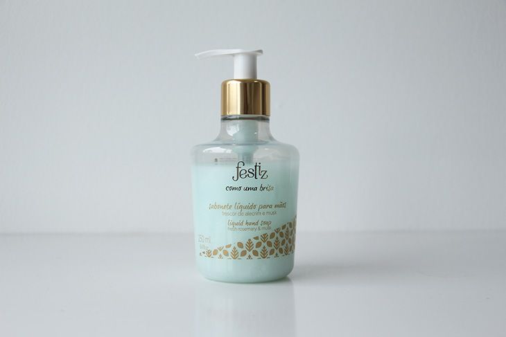 De acordo com a Festiz, o sabonete líquido traz uma deliciosa sensação de leveza, limpando delicadamente e deixando as mãos macias. Tenho usado várias vezes ao dia (tenho uma certa mania de lavar as mãos, risos) e gostado dele, viu? Um dado interessante é que, como o cheirinho é poderoso, acabo colocando pouco produto por aplicação. Então, pelo jeito, vai durar bastante por aqui!