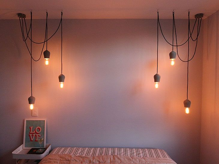 Como você viu no projeto em 3D, no quarto foram colocados 6 pendentes de cimento do modelo Bella, que funcionam como se fosse uma “luminária de cabeceira”, mas de um jeito diferentão. Bem no final do post tem uma surpresa para quem gostou desse modelo! Ah, para os pendentes, escolhi uma lâmpada decorativa bem fraquinha, que deixa uma iluminação baixa sem ofuscar.