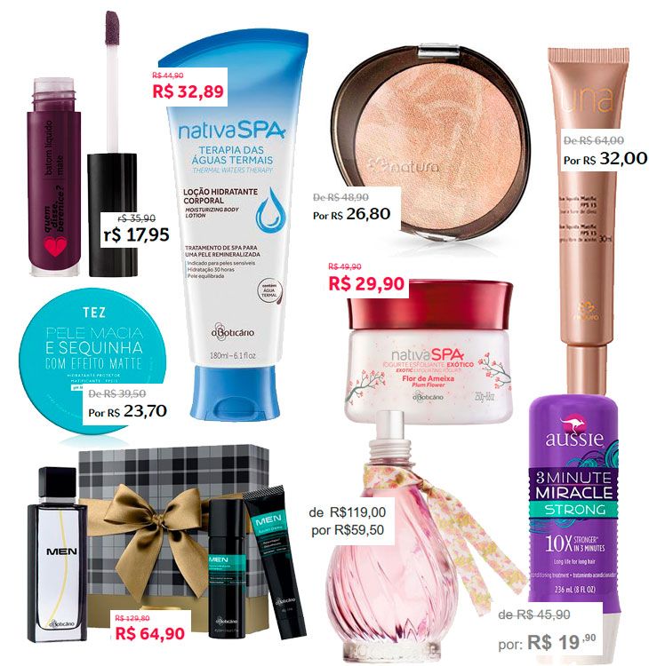 Boticário por exemplo, está liquidando a linha NativaSpa que mudou recentemente de embalagem e também as coleções antigas de maquiagem. Já a Natura continua com a promoção e nosso código de desconto está valendo hoje. Negócio é saber revirar os balaios e achar algo bacana. Fiz um pesquisa ontem e abaixo te mostro o que encontrei que me pareceu valer a pena, mas acredito que hoje as liquidações devem vir com força total.