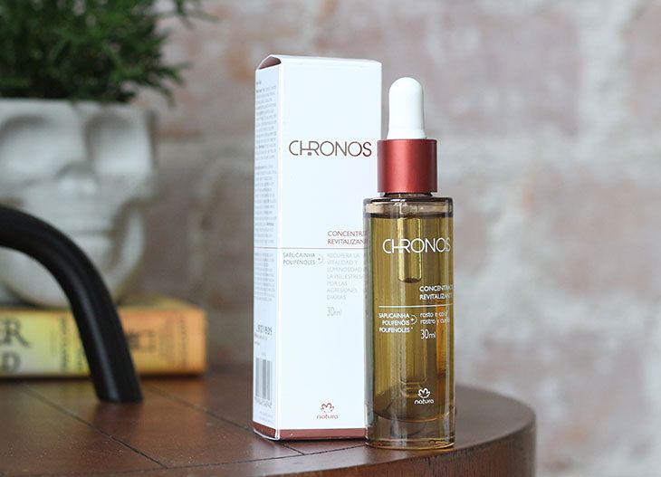Uma das novidades da Natura é o Concentrado Revitalizante, que veio dentro da linha Chronos. Segundo a marca, os benefícios são: ação antipoluição e anti-stress; textura ultraleve, com toque seco e aveludado; alívio do stress, deixando a pele macia e radiante e bloqueando os danos causados pela poluição. Ao longo prazo, teoricamente, ele desacelera os sinais do tempo e deixa a pele mais homogênea.