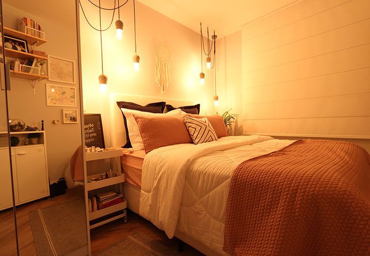 Caso você escolha ter um monte de travesseiros e almofadas, a dica é brincar com os tamanhos, colocando os maiores atrás e os maiores na frente.