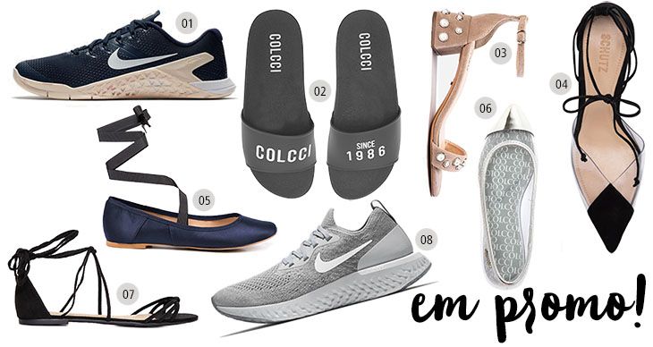 01. Tênis Nike Metcon 4: de R$ 599,90 por R$ 459,90 | 02. Rasteira Colcci: de R$ 99,90 por R$ 74,99 | 03. Sandália Amaro: de R$ 189,90 por R$ 74,90 | 04. Scarpin Schutz: de R$ 390,00 por R$ 272,90 | 05. Sapatilha Amaro: de R$ 149,90 por R$ 69,90 | 06. Sapatilha Colcci: de R$ 149,90 por R$ R$ 104,99 | 07. Sandália Anacapri: de R$ 139,90 por R$ 96,90 | 08. Tênis Nike Epic React: de R$ 699,90 por R$ 499,90